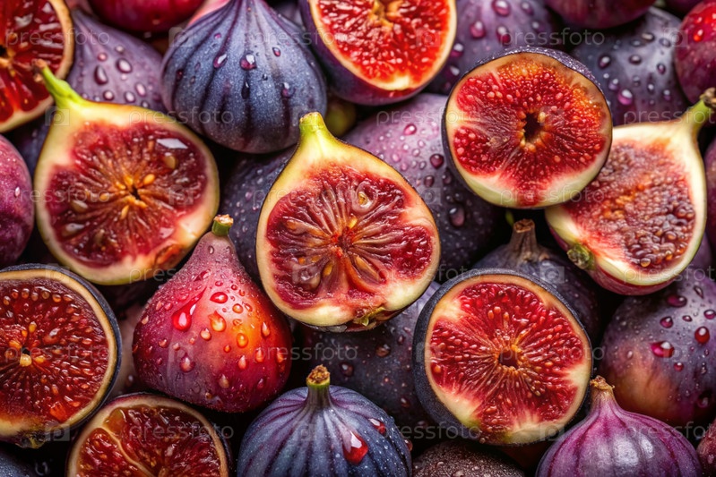 Есть много инжиров с деликатной фиолетовой кожей и в разрезе. рамка, показывающая естественную текстуру и цвет. закрытие фруктов