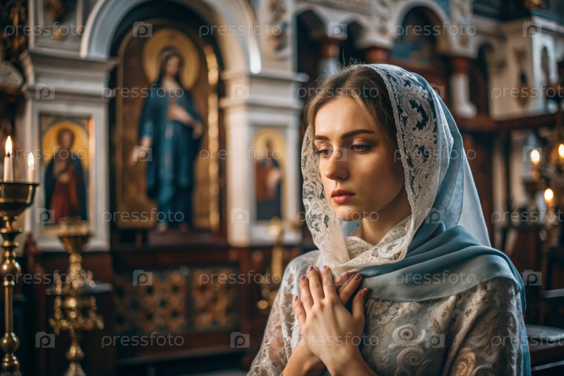 Портрет красивой молодой женщины с платками в православной церкви.Девушка молится в церкви среди икон