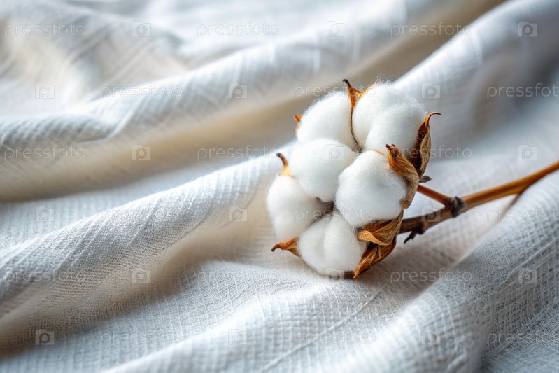 Текстильная промышленность. Хлопок. Хлопковый цветок на фоне белого хлопкового ткани. Место для текста