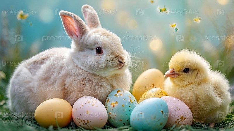 Концепция яркого пасхального праздника: нежные пасхальные яйца, кролики и куры на пастельном фоне