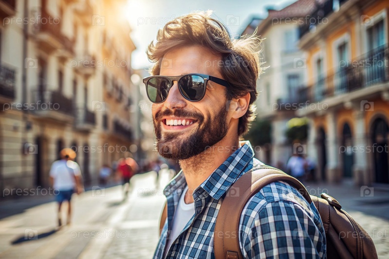 Портрет счастливого красивого хипстера-путешественника с рюкзаком и солнцезащитными очками. Сольное путешествие, образ жизни. Молодой турист наслаждается отдыхом в солнечный день