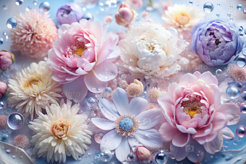 Красивый, воздушный, деликатный цветочный фон в синих и розовых тонах. цветы пиона, хризантемы, ромашки с каплями воды на лепестках