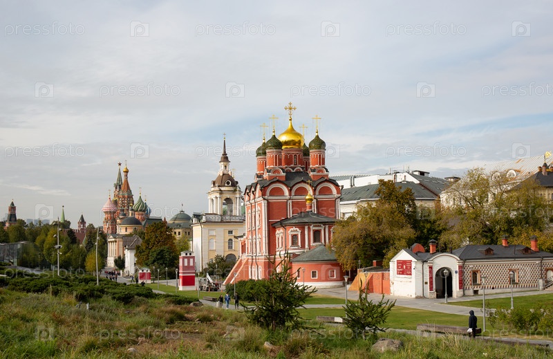 Красивая церковь у входа в парк Зарядье в Москве летом