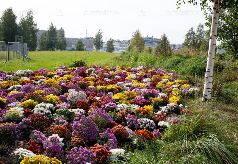 Красивое цветочное поле в парке Зарядье в Москве летом