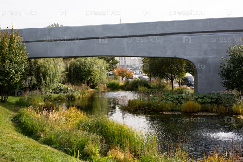 Красивый пруд в парке Зарядье в Москве летом
