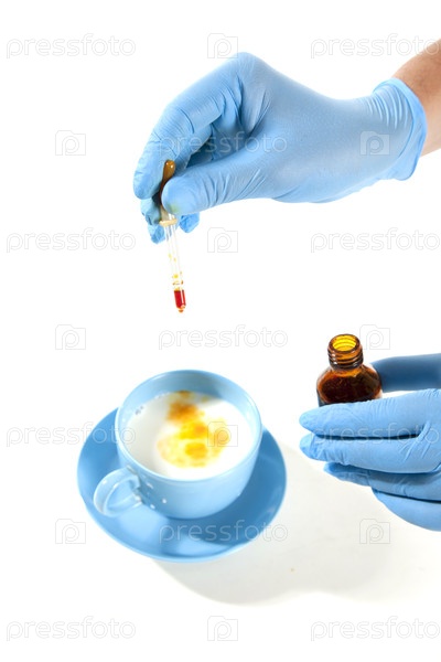 Доктора, руки качают каплями в жидкость в стеклянной посуде