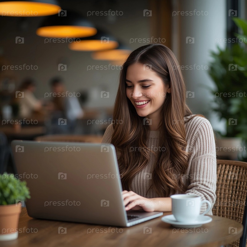 Девушка работает на ноутбуке в уютном кафе