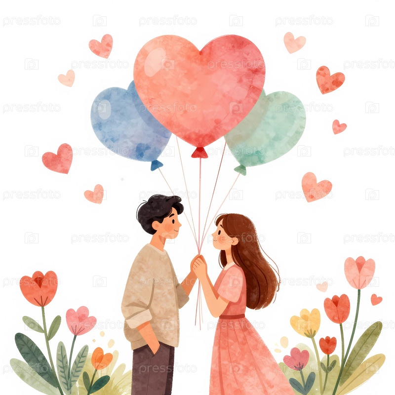 Влюбленные с воздушными шарами и цветами