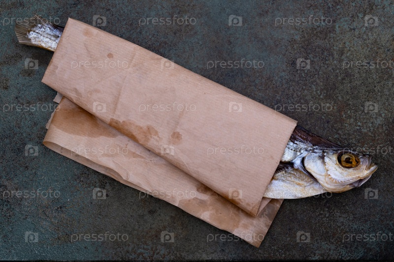 Соленый сушеный меч, завернутый в коричневую пергаментную бумагу на серой поверхности