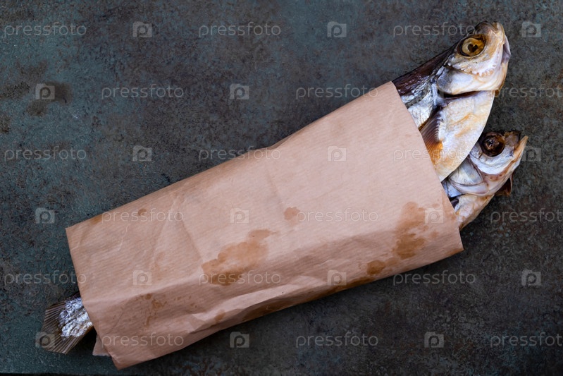 Осушенная рыба, завернутая в пергаментную бумагу на поверхности куста