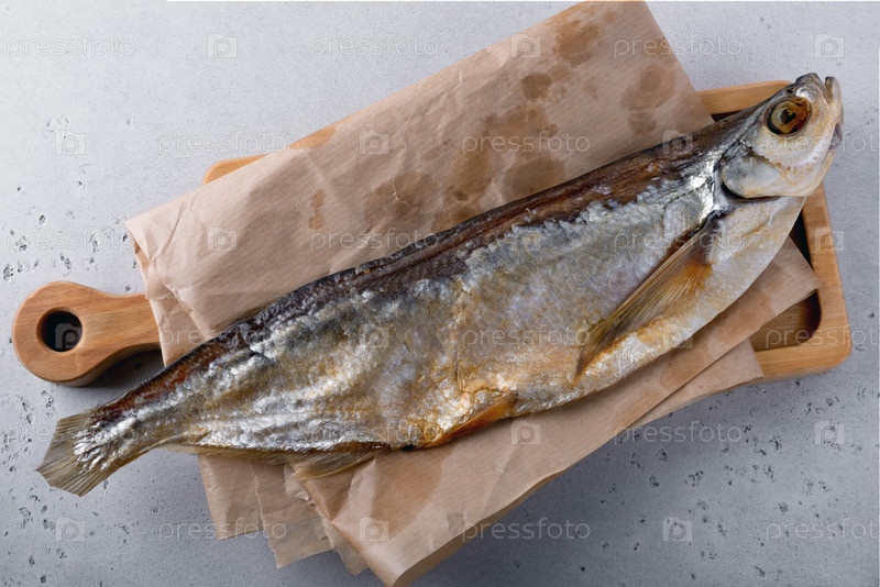 Соленая рыбка-сабле карп на коричневой пергаментной бумаге Фон Display