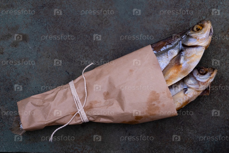 Осушенная рыба, завернутая в пергаментную бумагу на поверхности куста