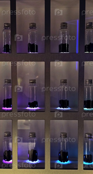 Флуоресцентная коллекция: банки с таинственным содержимым в свете неоновых огней