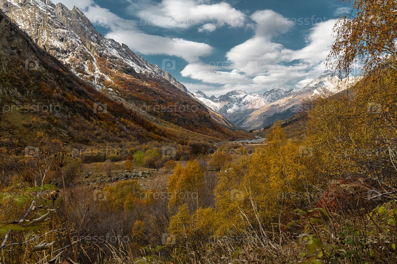 Вид на высокие заснеженные горы и лесистые склоны в ущелье Домбай-Ульген