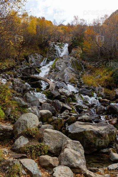 Вид на водопады Чучхур, спускающиеся по скалистому лесистому склону в ущелье Домбай-Ульген, заповедник Теберда, Северный Кавказ. Прекрасный осенний пейзаж. Путешествия и походы в пустыне