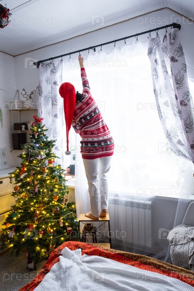 Женщина в шляпе Санты вешает занавески спальни на светофорах с рождественской елкой и рождественским украшением, когда она готовится к Новому году