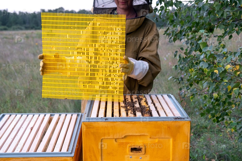 Пчеловодка, женщина в защитном костюме от укусов пчёл, устанавливает разделительную сетку в улье