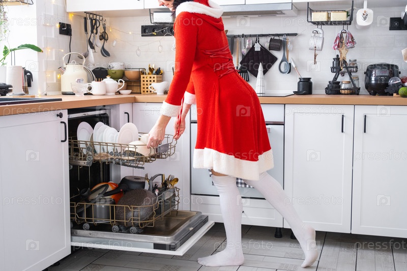 Женщина в костюме Деда Мороза загружает кучу грязной посуды на праздничной кухне в посудомоечную машину. Помогите хозяйке. Уборка кухни к Рождеству и Новому году