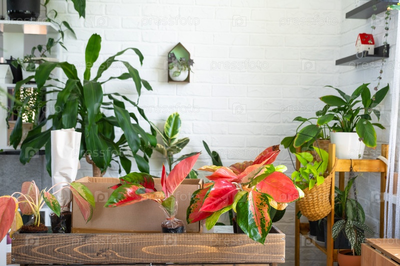 Распакование красного агалонема из питомника - заказ упакованных тропических растений, доставка. Продажа, безопасная отправка растений из магазина, упаковка. Цветочный магазин, домашний бизнес