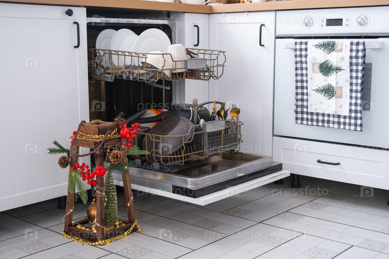 Много грязной посуды в посудомоечной машине на праздничной кухне. Помогите хозяйке, экономике и окружающей среде. Уборка на кухне к Рождеству и Новому году, после пира и гостей