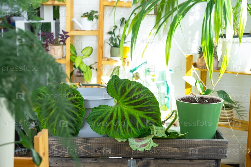 Филодендрон на столе для пересадки и ухода за домашними растениями в интерьере теплицы с горшковыми растениями