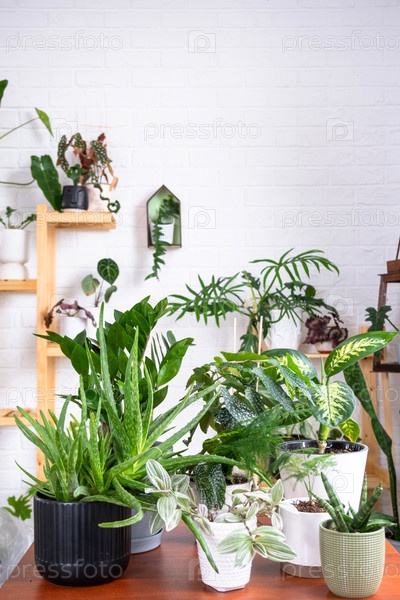 Группа популярных комнатных растений на столе в интерьере: Calatea, алоэ, diffenbachia, sansevieria, ficus. выращивание и уход за комнатным растением, теплицей, орошением, удобрениями