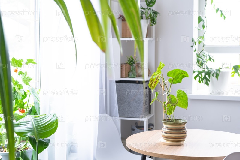 Philodendron verrucosum в белом интерьере на круглом столе в керамической сковороде на фоне окна. выращивание и уход за комнатными растениями, теплицей, оранжерейкой. минимализм