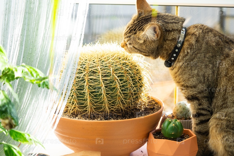 Домашняя кошка жует кактус, портит горшочное растение на подоконнике. Опасность для домашнего питомца от ядовитых комнатных растений. юмор