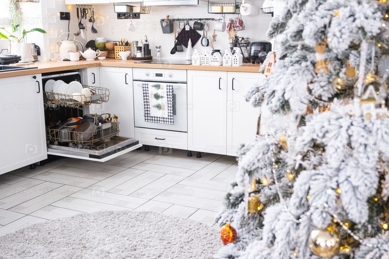 Много грязной посуды в посудомоечной машине на праздничной кухне. Помогите хозяйке, экономике и окружающей среде. Уборка на кухне к Рождеству и Новому году, после пира и гостей