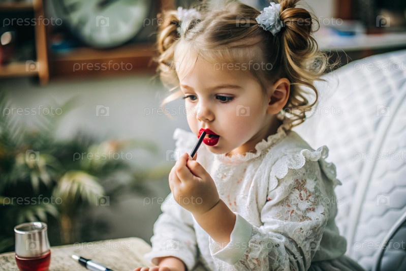 Красивая, забавная девушка в платье рисует губы красной помадой как мама.Девушка играет с женской косметикой