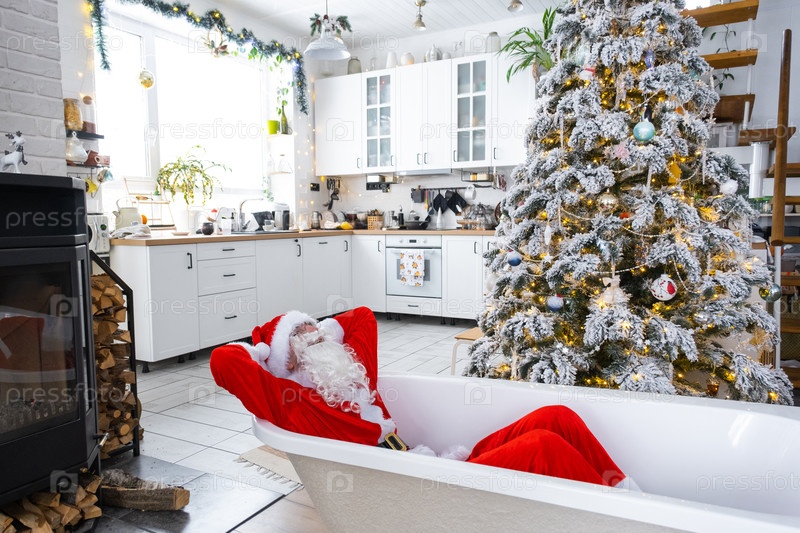 Санта отдыхает в новой бане под рождественской елкой как новогодний подарок в интерьере белой современной украшенной кухни. Реконструкция и дизайн интерьера, строительство и улучшение дома
