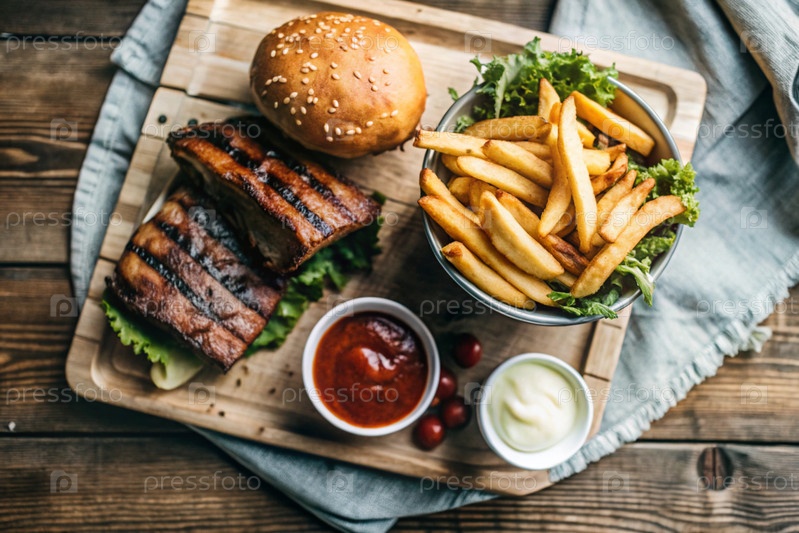Фри, гамбургеры, свиные ребра на стильной доске на деревянном фоне. жареный картофель. концепция фаст-фуда, нездоровой еды и приготовления быстрого питания