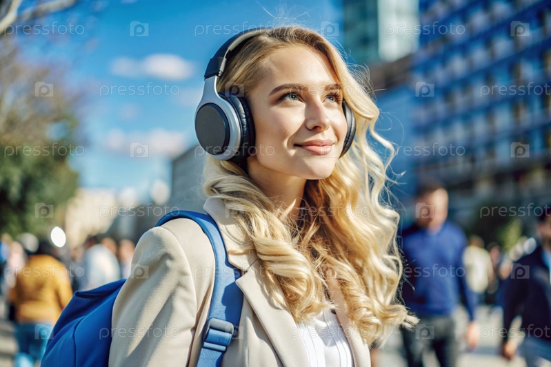 Музыкальный любитель. молодая красивая кудрявая женщина с рюкзаком на фоне улицы и людей. Турист слушает музыку в наушниках и гуляет по городу