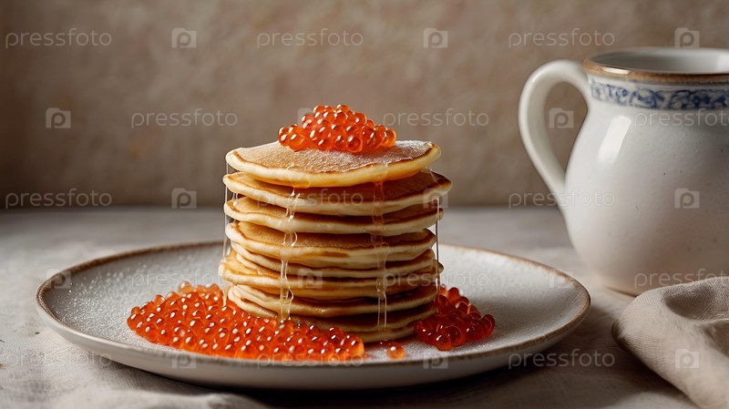 русские традиции. российский праздник Масленица. натюрморт с кучей блинов и красной икры на светло-бежевом фоне