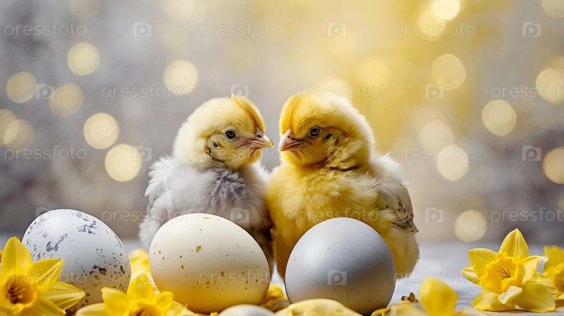 Нежные пасхальные яйца, желтые куры, цветы цыплят и нарцисс на фоне пастельного акварели с нежными венами