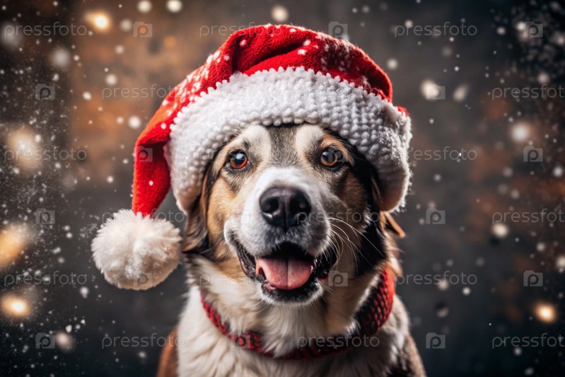 С Новым годом и счастливыми Рождествами! Падает снег. Веселая собака сидит в шляпе Санта-Клауса. Собака ждет праздника