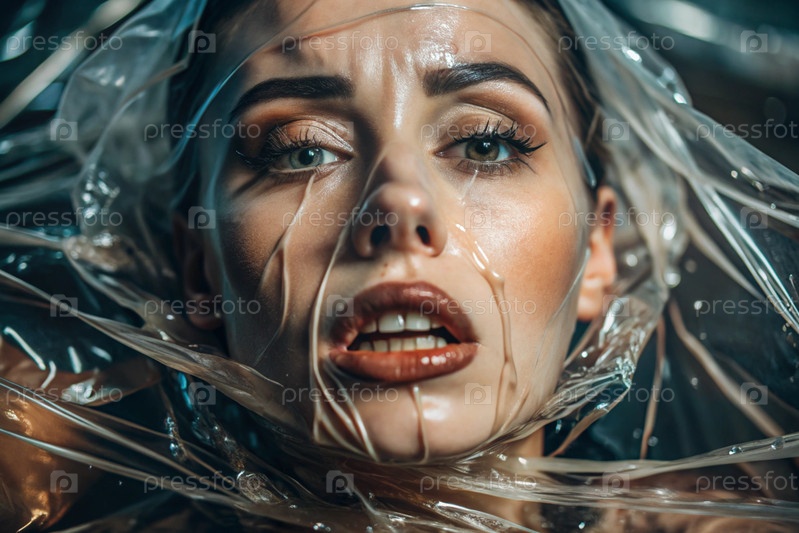 Девочка завернута в целлофан или сумку. Девушка задыхается. Пластиковое загрязнение планеты. Опасность для окружающей среды. Сокращение повторного использования пластика. Переработка. Концепция мусора