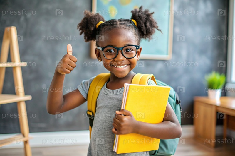 Милая чернокожая афроамериканка с очками показывает класс рукой. Ребенок впервые идет в школу. Ребёнок со школьной сумкой и книгой. Ребёнок в классе с доской. Возвращение к школе