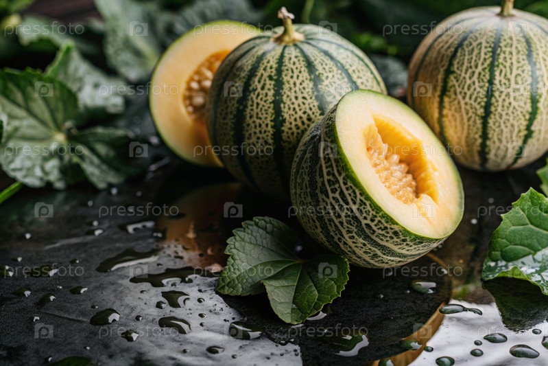 Свежие дыни.Вкусные ягоды и фрукты ярко-желтого цвета с каплями воды.Вегетарианство.Здоровое питание.Свежий плод на столе