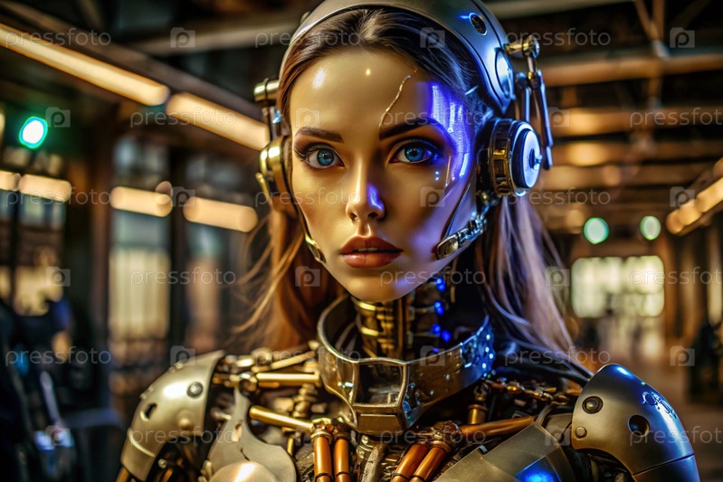 Женский робот-киборг. Интеграция технологий и человеческого взаимодействия. Производство роботов. Искусственный интеллект, Интернет и цифровые технологии будущего