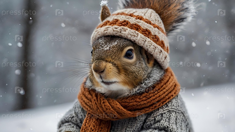 белка с большими щеками, одетая в уютную мягкую серую тёплую одежду, шляпу и шарф на зимнюю тематику