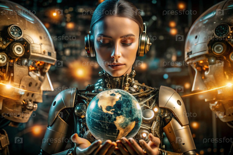 Женщина-киборг с моделью планеты в руке Интеграция технологий и человеческого взаимодействия Производство роботов Искусственный интеллект, Интернет и будущие цифровые технологии