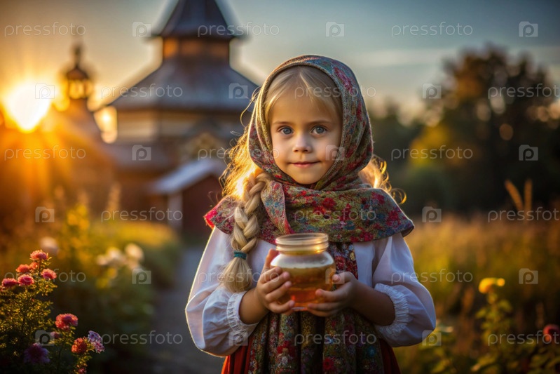 Концепция российского православного праздника 'Мед Спаситель' - красивая маленькая девочка в русской национальной одежде и шарф с баночкой меда на фоне православной церкви