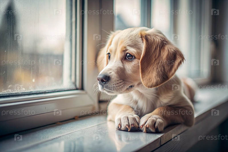 Маленький щеночек смотрит в окно и ждет своего хозяина