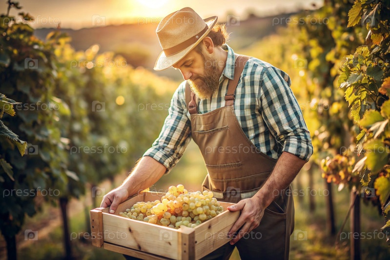 Сельскохозяйственная промышленность. Производство вина. Деревянный ящик с виноградом в руках фермера-мужчины. Садовник собирает богатый урожай. Ближе, солнечный свет. Осенний плодовый сбор