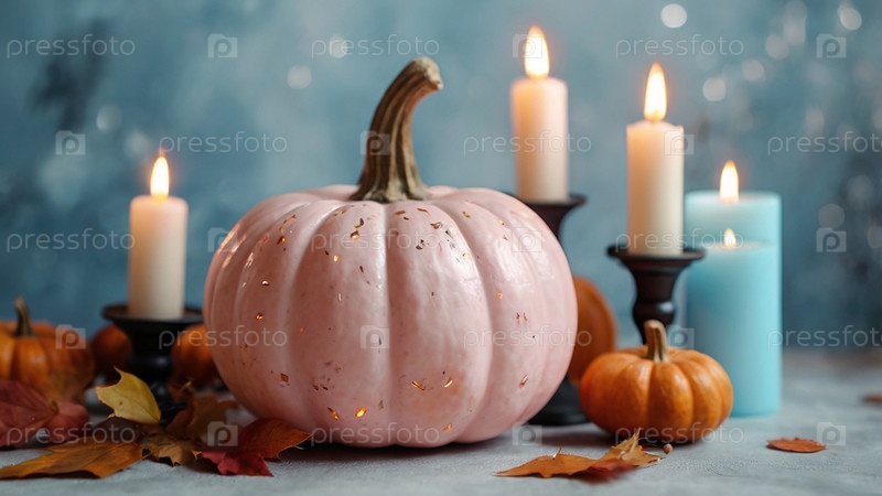 Пастельный розовый и синий тыквенные цвета, светло-синие и розовые свечи и осенние листья на светлом фоне