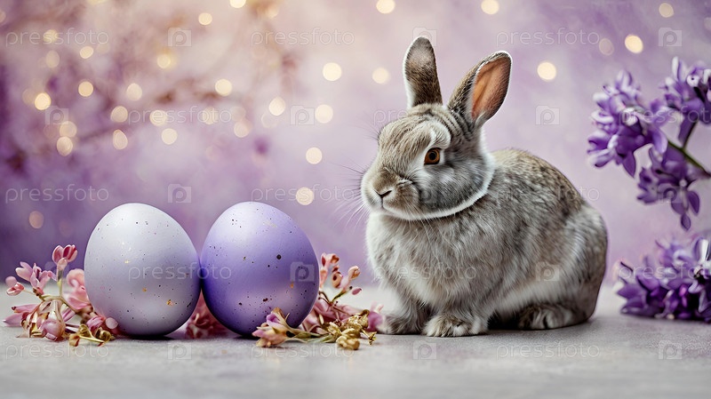 Нежные пасхальные яйца, серый кролик и фиолетовые цветы гиацинта на пастельном акварельном фоне с нежными венами