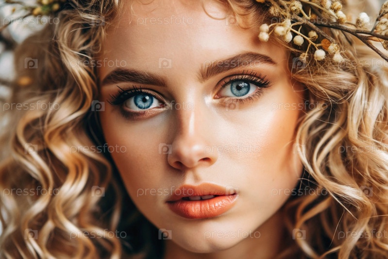 Глубокий эмоциональный портрет.Лицо молодой девушки без макияжа с выразительными глазами и блондинскими кудрявыми волосами.Естественная женская красота