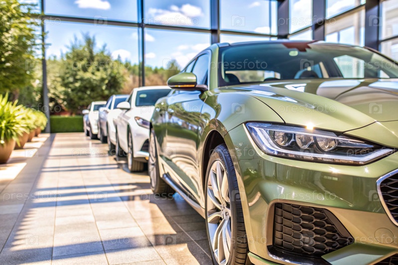 Офис современного автосалона. Бизнес-концепция продаж и аренды автомобилей. Новый автомобиль припаркован в современном автосалоне. Концепция автолизинга и страхования. Электрическое транспортное средство