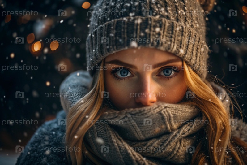 Зимний портрет: блондинка с ярко выраженными голубыми глазами в вязанной шляпе, шарфе и свитере
